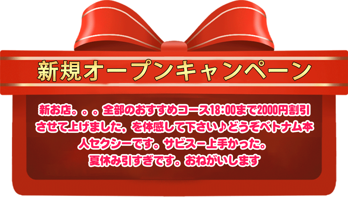 | 待 遇 | 完全全額日払い制 優しく笑顔でお客様に接客できる方、おしゃべりが好きな方。 出勤後に一時外出することもできます。 指圧整体等の経験者は優遇させていただきます。 |